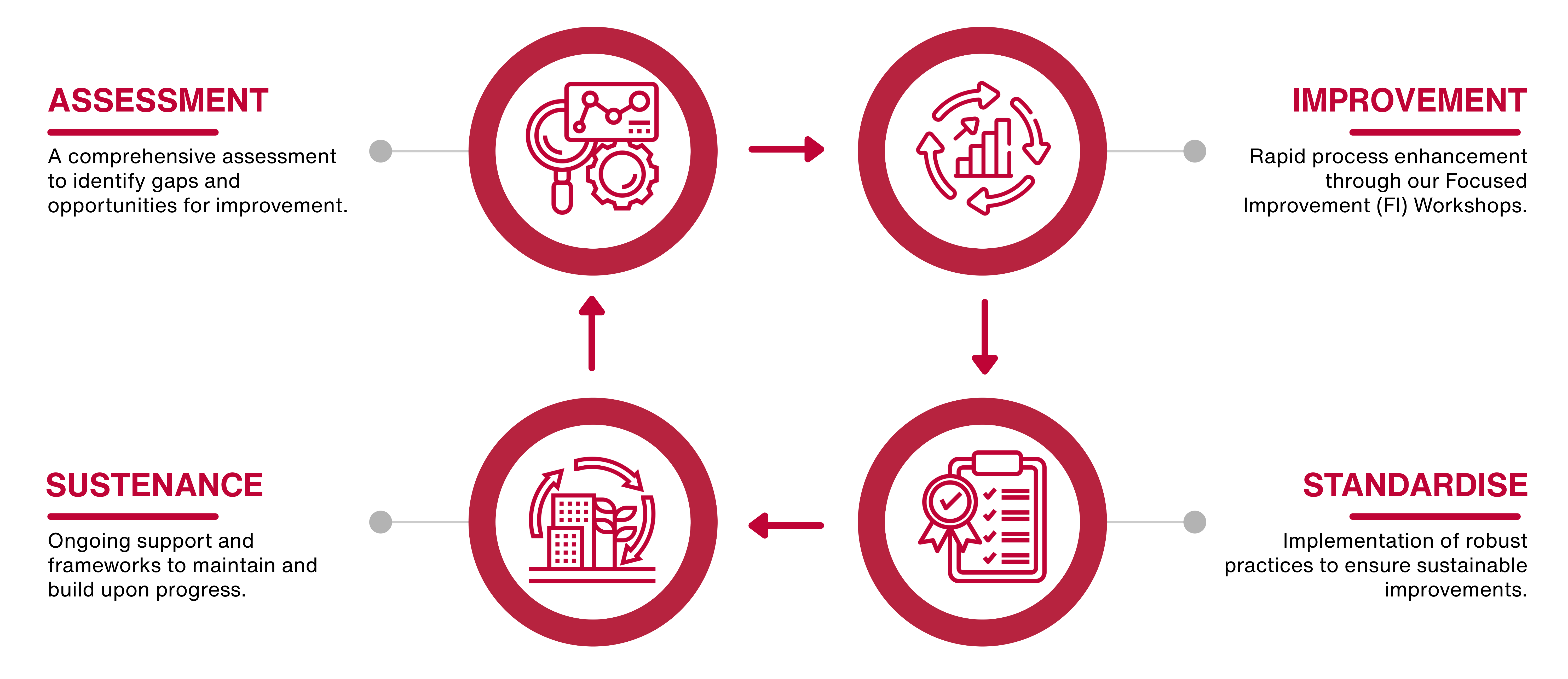 KIAP’s methodology has two core elements – rapid process improvement through Focused Improvement (FI) Workshops and Assessment Based Handholding for sustenance post the improvement phase.